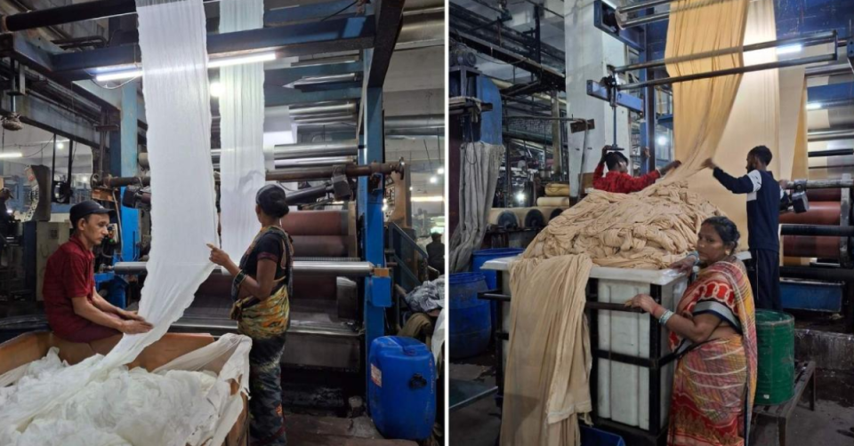 Standing next to a jet dyeing machine, Divya deftly pulls out 6,000 meters of dyed fabric with ease.
